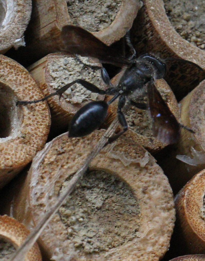 Co to za owad który znosi do rurek suche źdźbła, Podobny jest do gliniarza ale nie ma nic żółtego na nogach i odwłoku oraz nie zalepia otworów (te zalepione to od pszczół murarek), Na następnym zdjęciu widać wypełnione źdźbłami bambusowe rurki w całości.